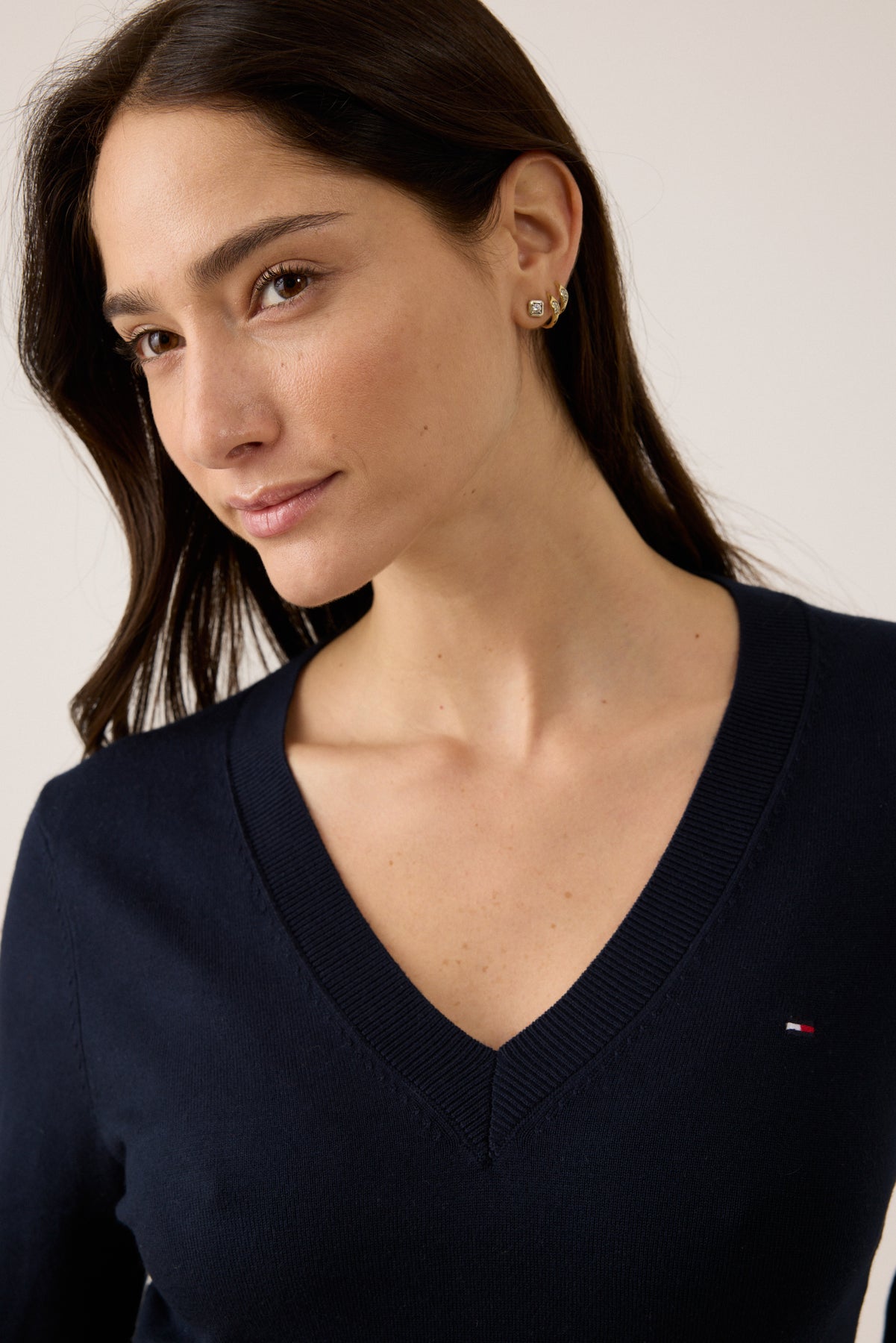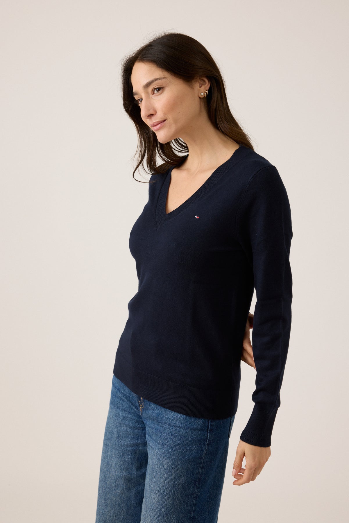 סוודר נשים בגזרת SLIM מחמיאה, עיצוב קלאסי עם צווארון V מעניק טאץ’ המתאים לעבודה, לפנאי וללוק קז’ואל-אלגנטי יומיומי.