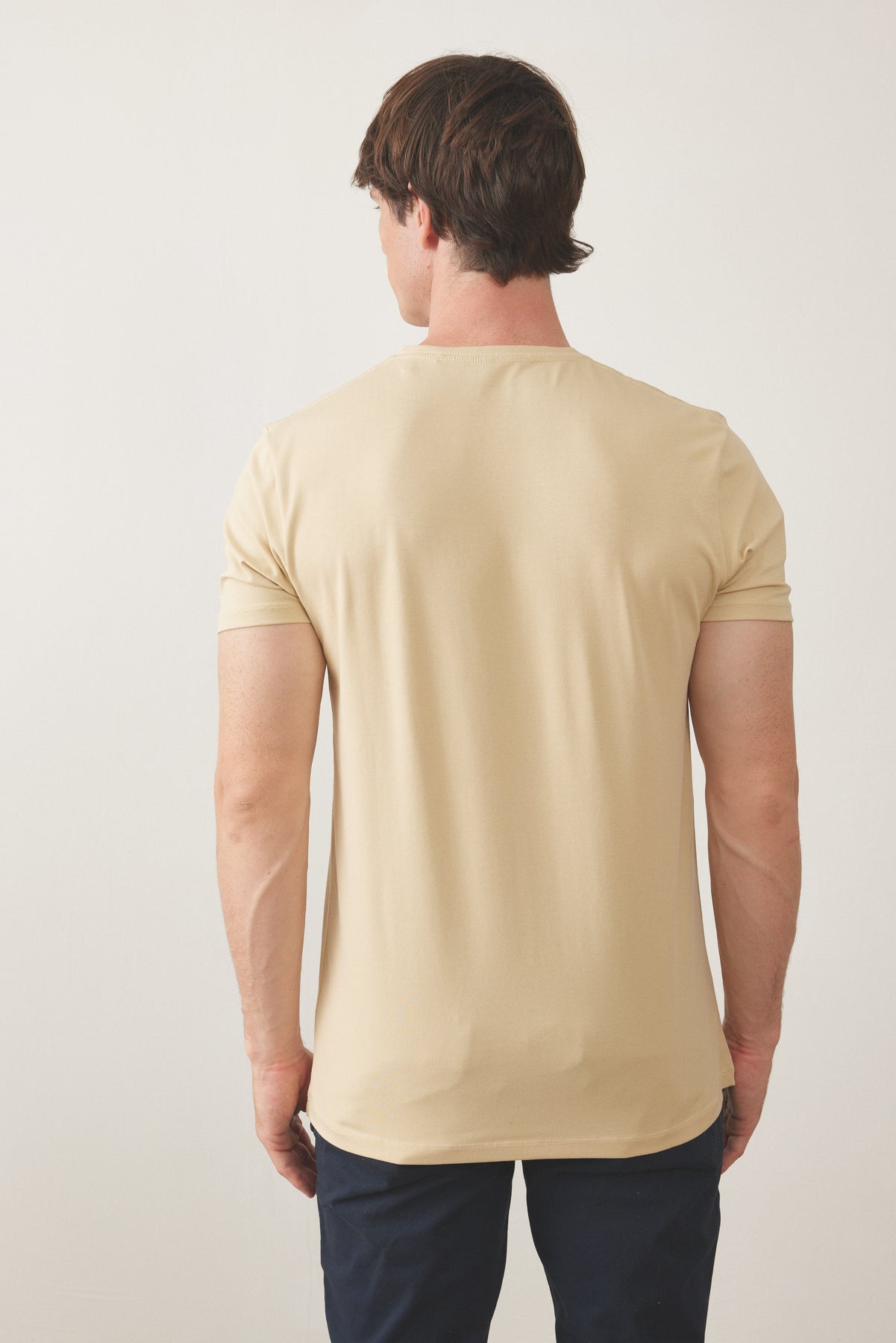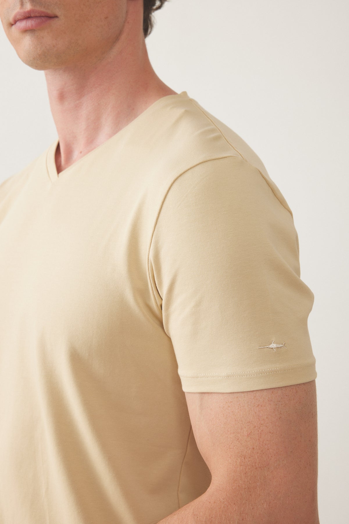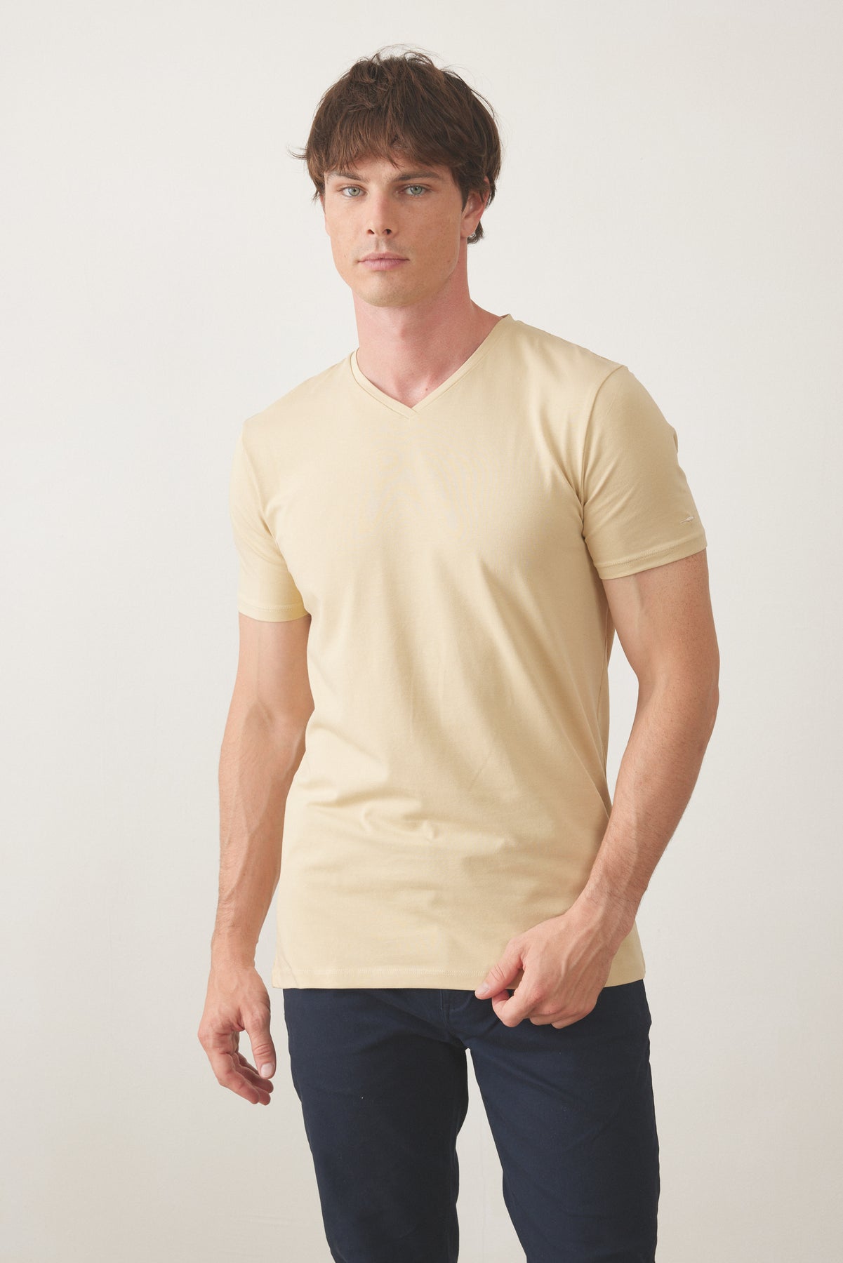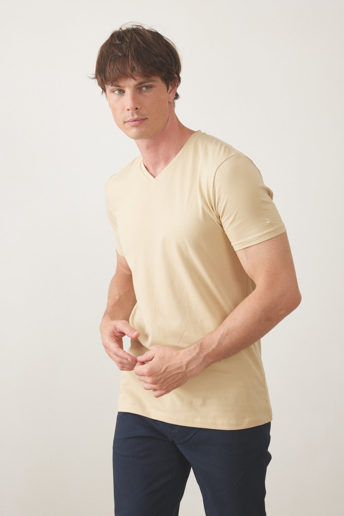 חולצת טי־שירט קלאסיתצווארון V בגזרה מחמיאה, עשויה מבד לייקרה נמתח ורך המותאם לכל מבנה גוף. הבד האלסטי מאפשר נוחות מקסימלית ותחושת חופש בתנועה, תוך שמירה על מראה מוקפד ואלגנטי. החולצה מתאימה ליום־יום, לשילוב עם ג'ינס, מכנסיים מחוייטים או אפילו מתחת לז'קט – פריט בסיסי וחיוני במלתחה שכל גבר צריך.