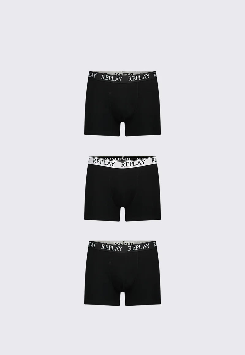 שלישיית תחתוני בוקסר בצבע שחור/לבן/אפור ממותג REPLAY מספקת נוחות יומיומית ואיכות בד גבוהה. הסט כולל שלושה זוגות תחתוני בוקסר