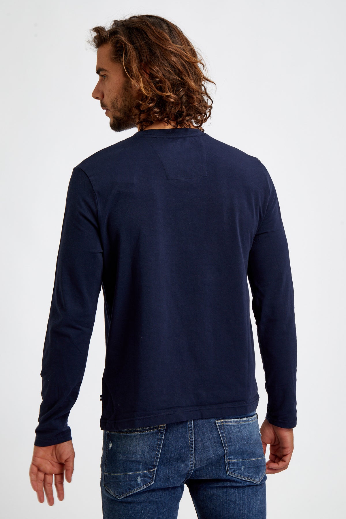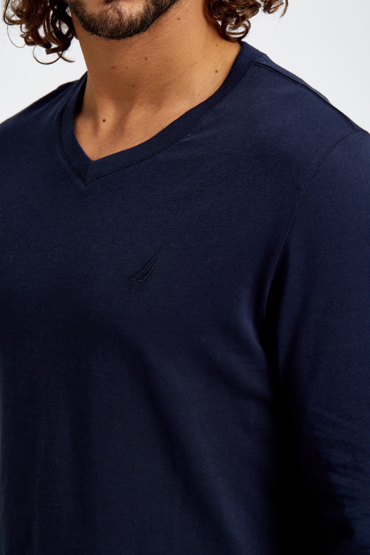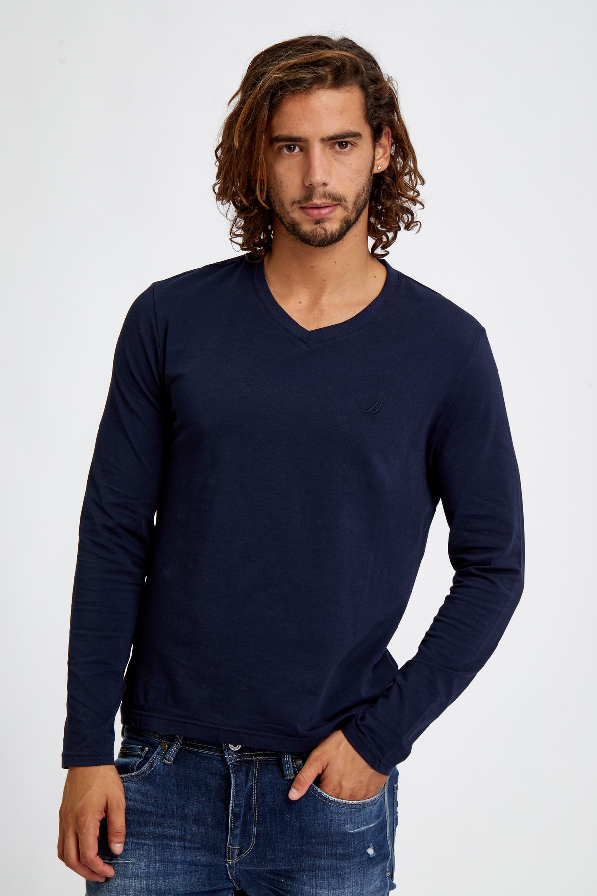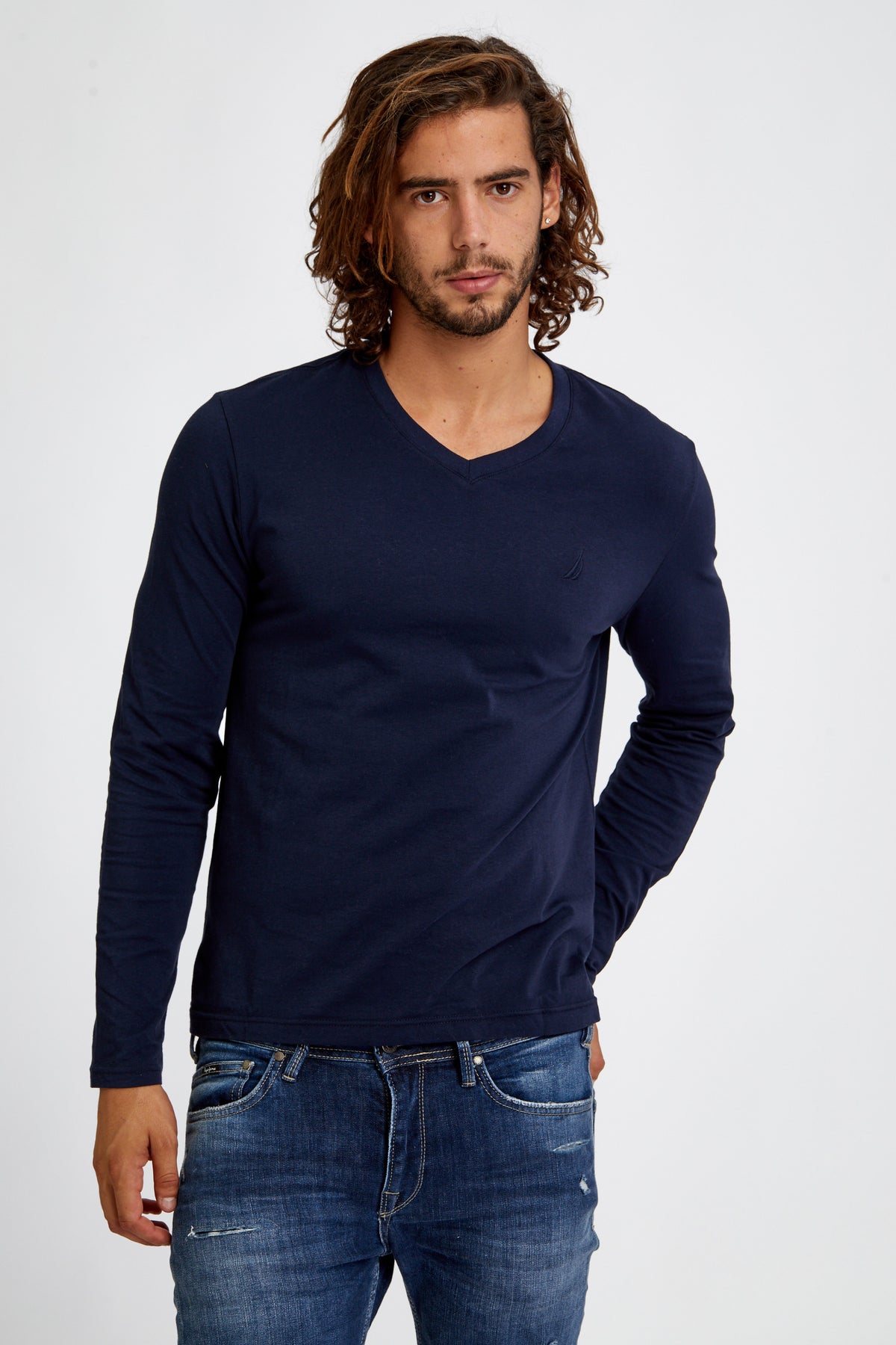 • בצבע נייבי מפתח צווארון וי  חולצת טישרט שרוול ארוך של NAUTICA   עם לוגו רקום