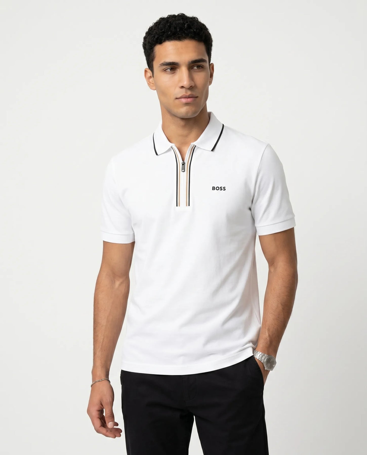 אלגנטיות ספורטיבית בלתי מתפשרת עם חולצת הפולו הקלאסית מבית BOSS (הוגו בוס). בצבע לבן בוהק, חולצה זו מציעה מראה פרש, נקי ומסודר שמתאים למגוון הזדמנויות. מיוצרת מבד נושם ונעים למגע המבטיח נוחות גם בימים חמים, עם עיצוב פולו קלאסי הכולל צווארון ורכיסת כפתורים להשלמת המראה המוקפד.