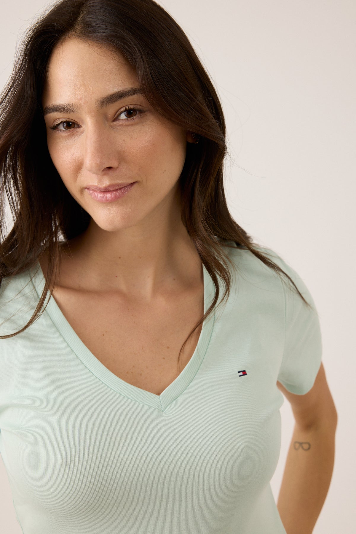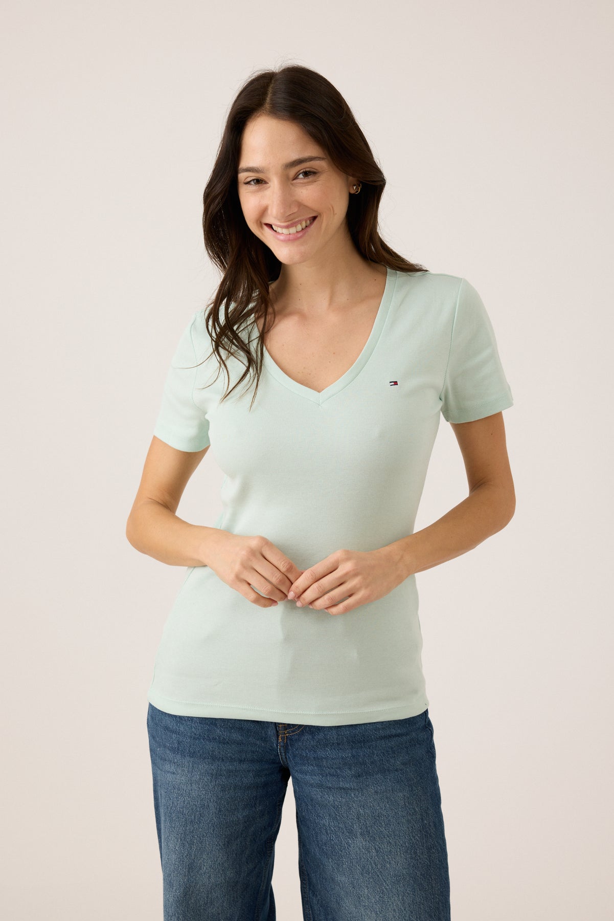 "גלי את הטישרט נשים קצר צווארון V החדשה של מותג טומי, חלק מקולקציית נשים 2025. טישרט זו מציעה שילוב מושלם של סגנון, נוחות ואיכות.