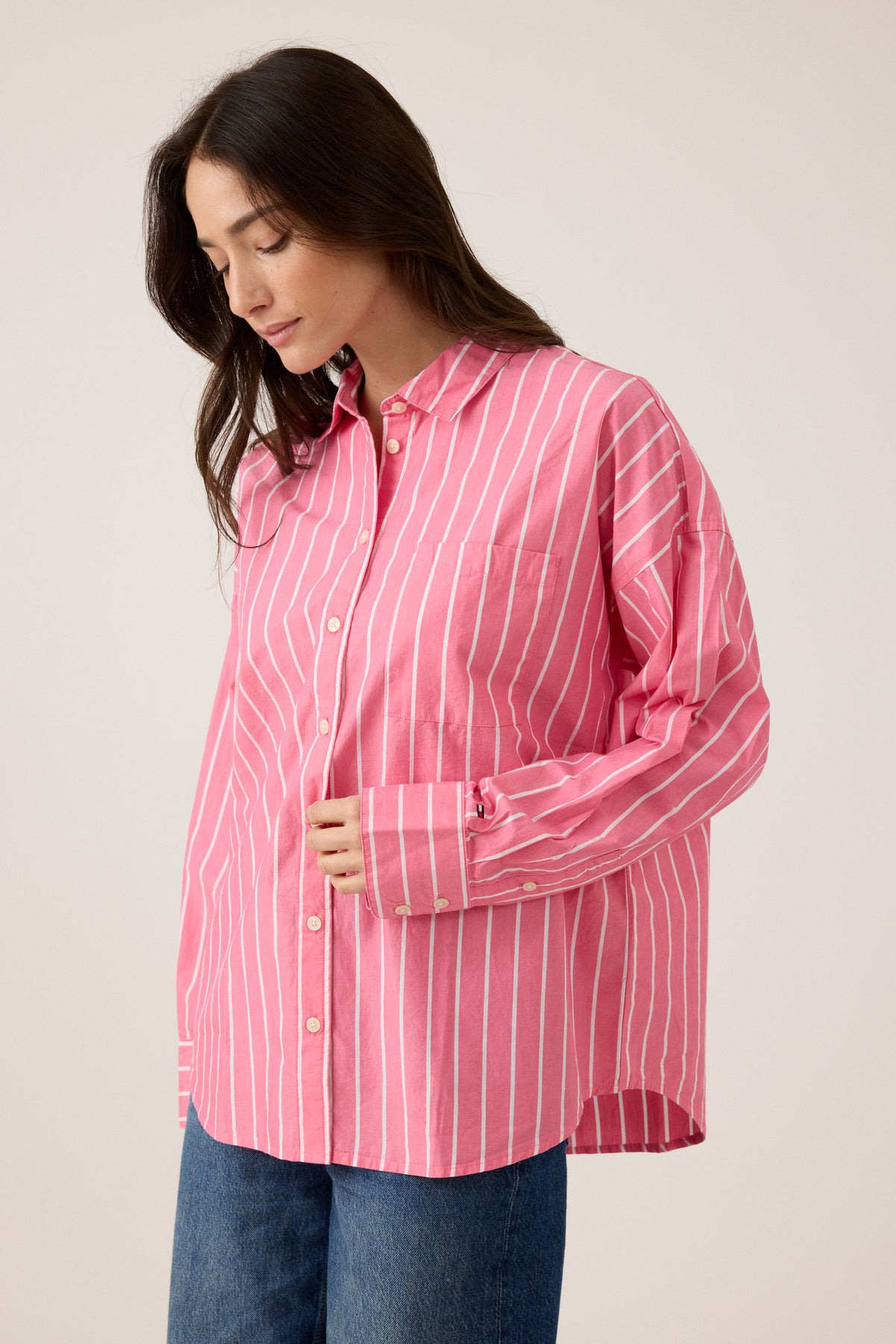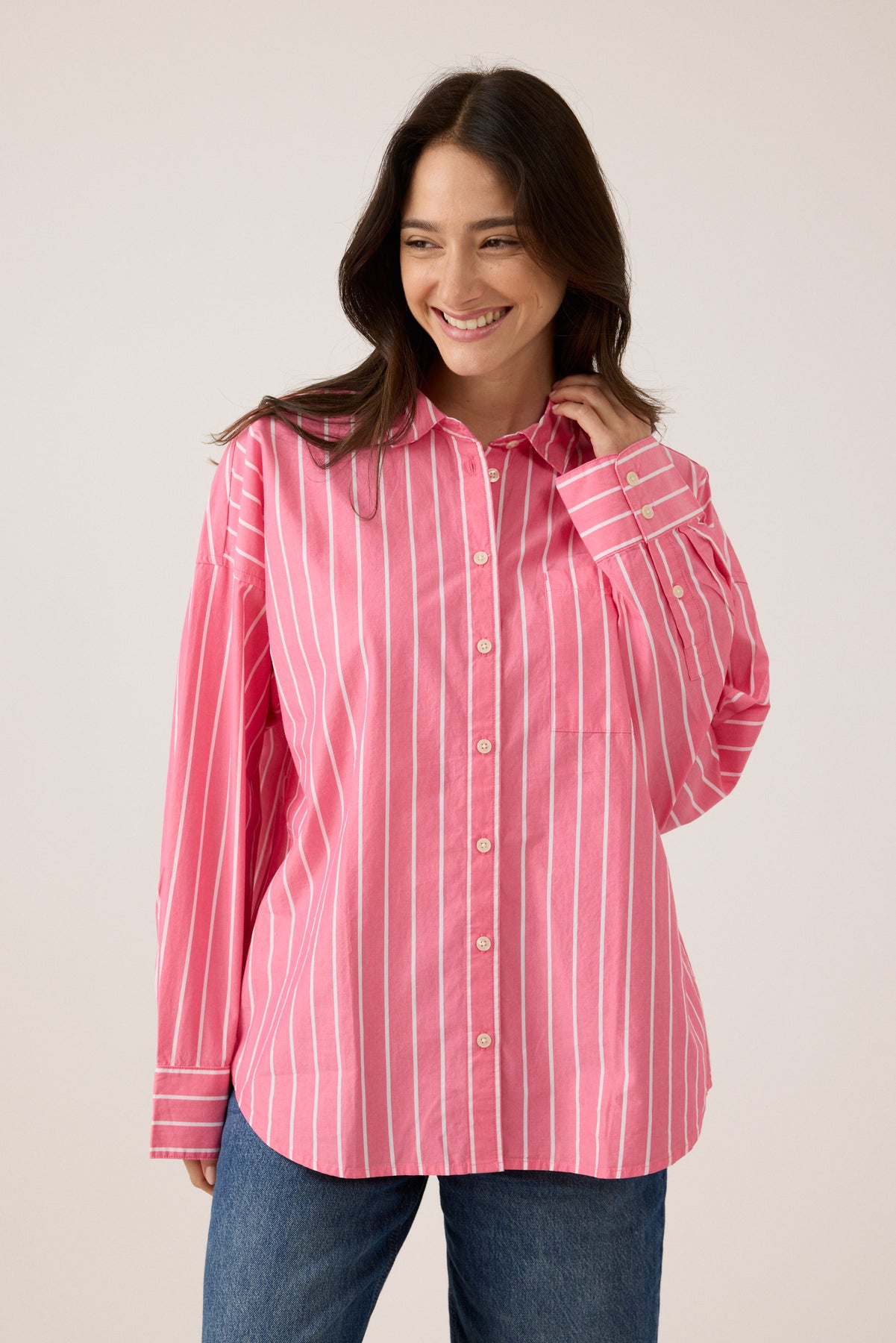 החולצה מעוצבת בדוגמת פסים קלאסית, עם צווארון מחויט, כפתורים קדמיים וכיס חזה, ומשלבת את האסתטיקה העל-זמנית של המותג עם נוחות מקסימלית. מתאימה ללבישה פתוחה מעל טי, סגורה עם ג’ינס או כשכבת מעבר קלה – ורסטילית ונכונה לכל עונה.