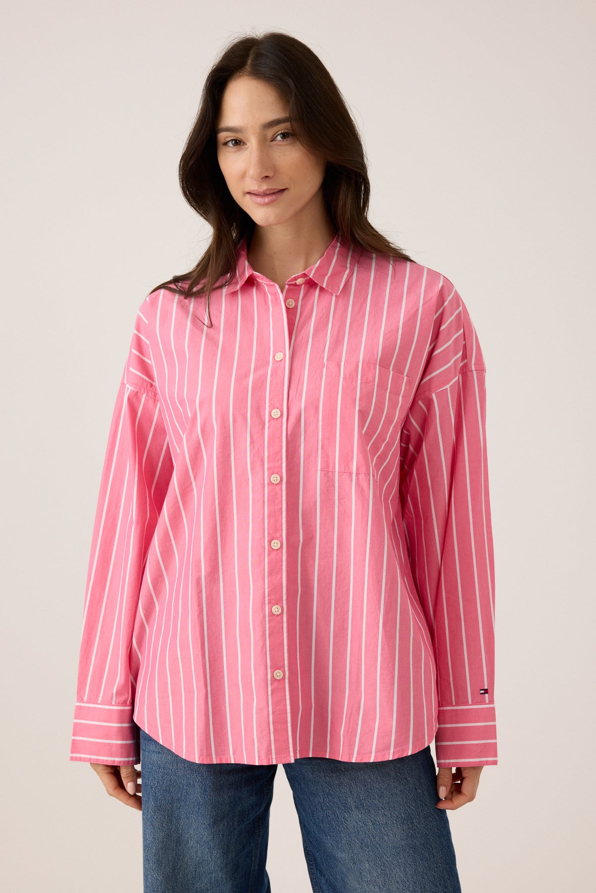 חולצה מכופתרת אוברסייז לנשים מבית Tommy Hilfiger, המשלבת עיצוב איקוני עם סטייל מודרני ונינוח. גזרת האוברסייז יוצרת מראה טרנדי ולא מתאמץ, מושלם ללוק יומיומי מוקפד עם נוכחות.