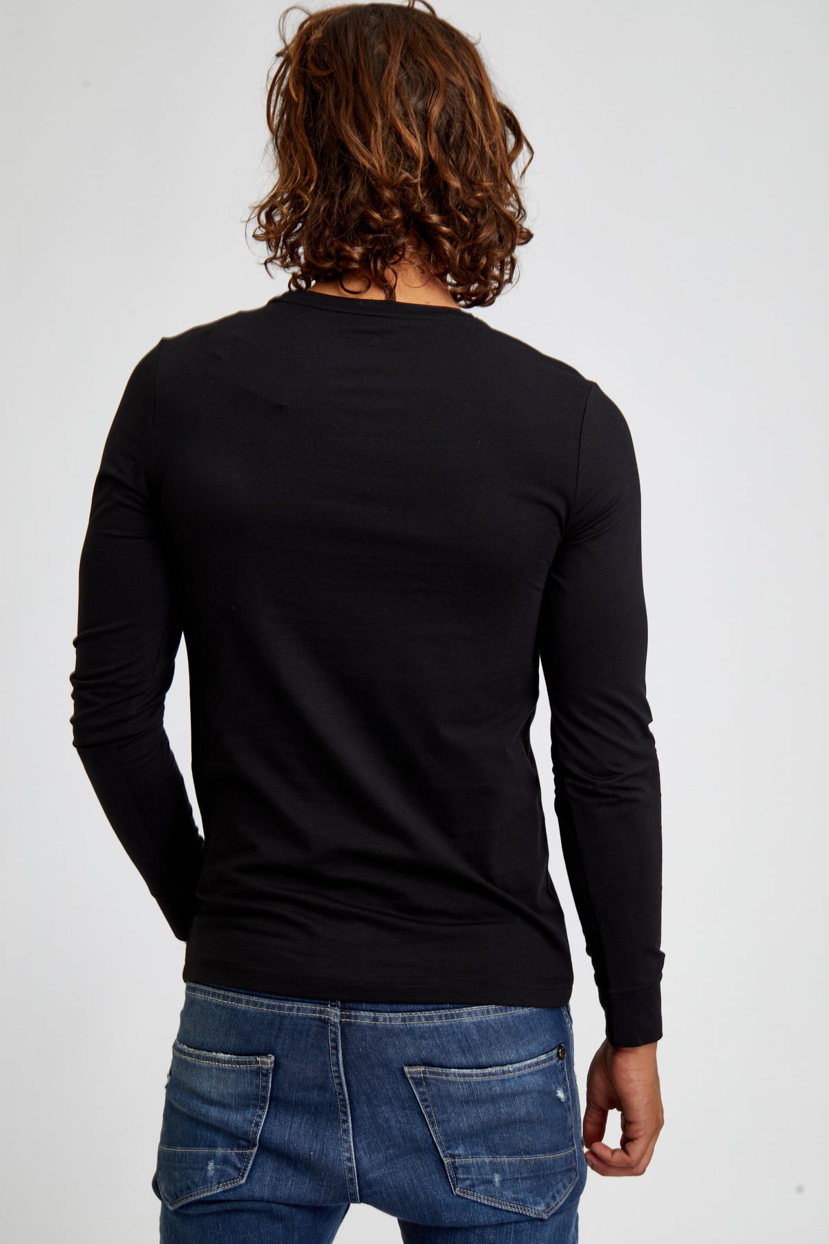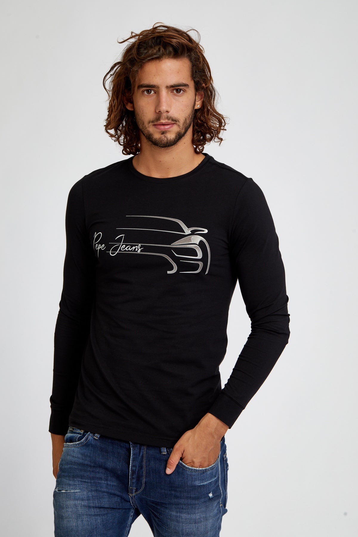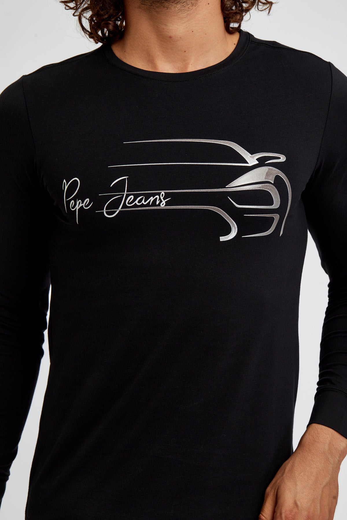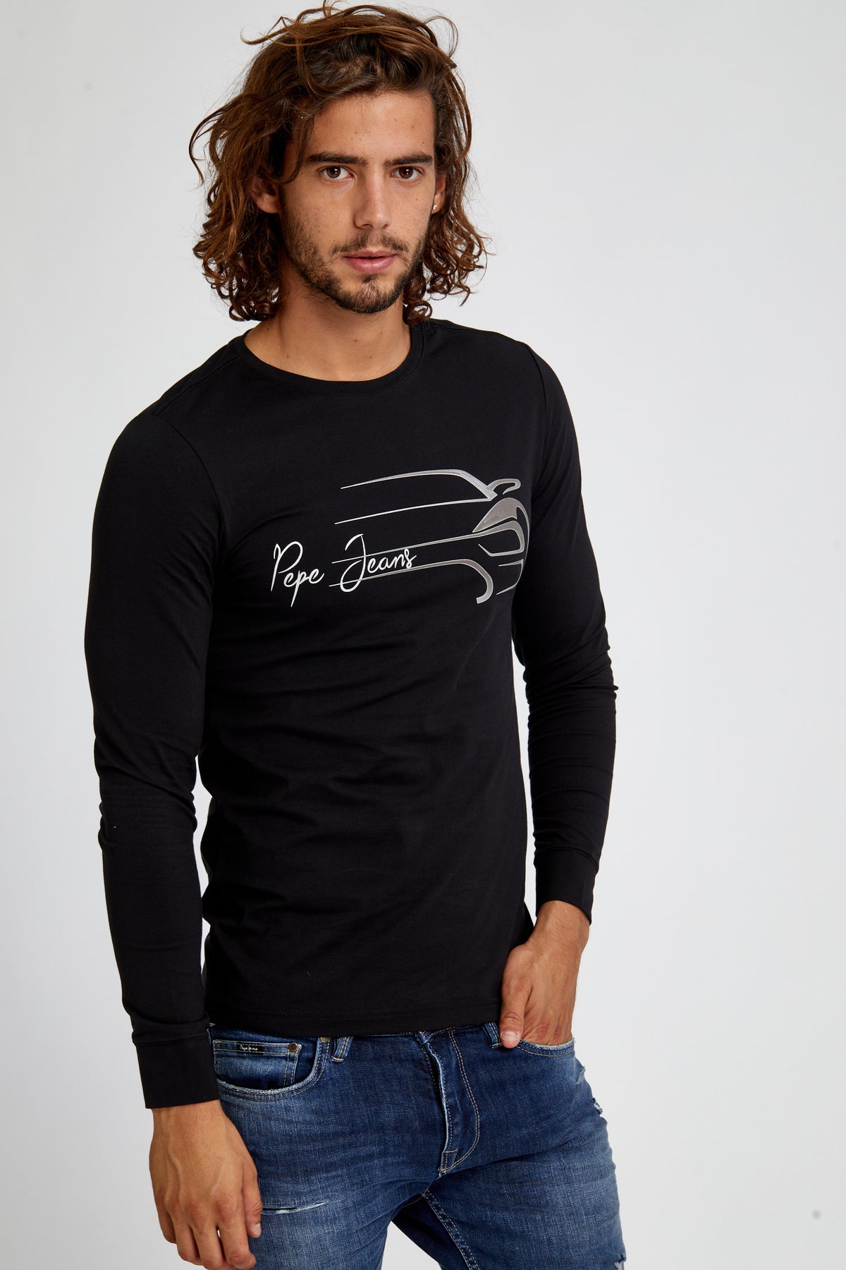 • בצבע שחור מפתח צווארון עגול חולצת טישרט שרוול ארוך של PEPE JEANS   עם הדפס
